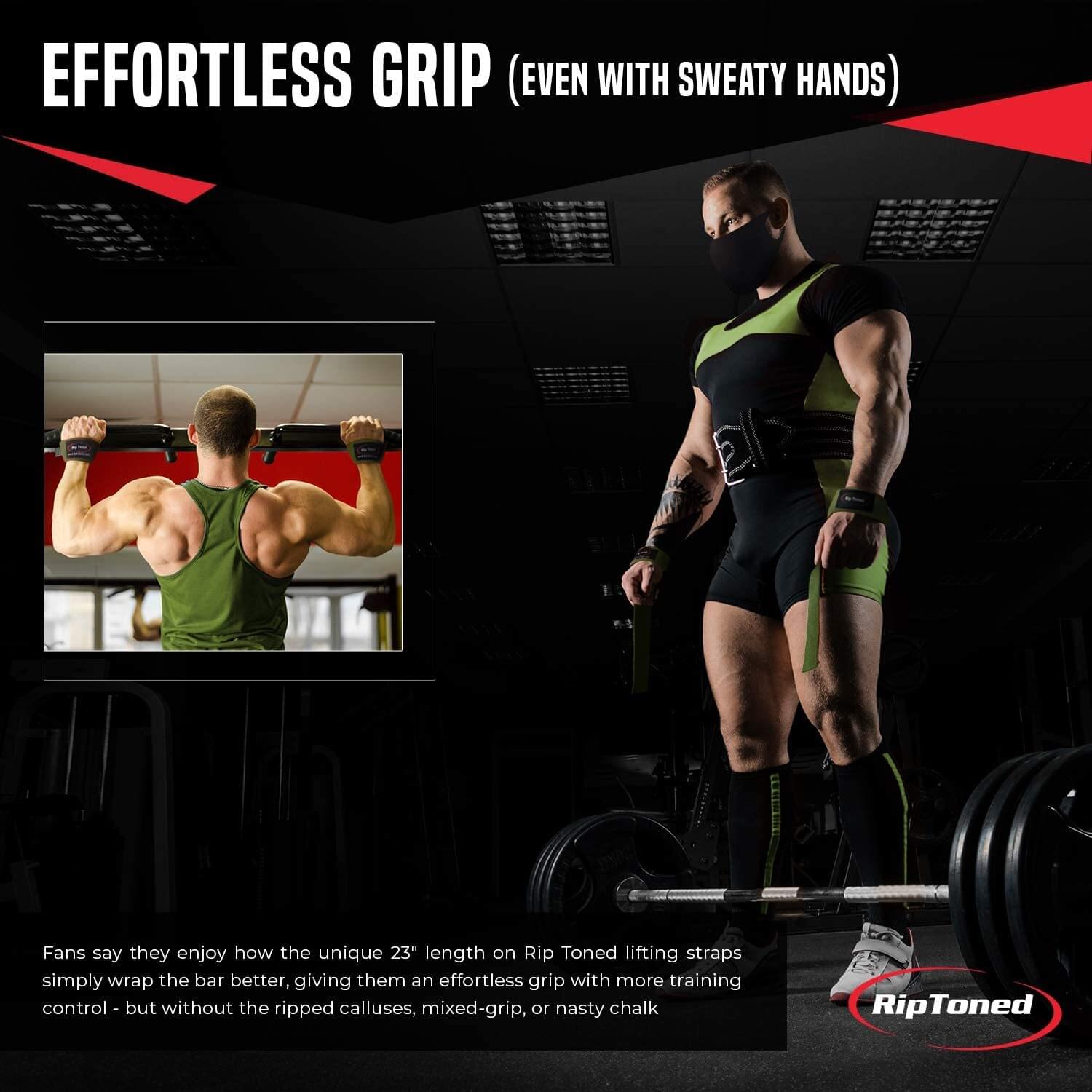 EFFORTLESS GRIP (EVEN WITH SWEATY HANDS): Fans say they enjoy how the unique 23" length on Rip Toned lifting straps simply wrap the bar better.